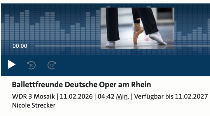 Im Rahmen des Kulturmagazins „Mosaik“ des WDR 3 Hörfunks werden regelmäßig Freundeskreise vorgestellt. Am 11. Februar 2026 befasste sich das Kulturmagazin nun mit den Ballettfreunden in Düsseldorf. Renate Raeune, Egon Schawe sowie Marlúcia do Amaral waren ins WDR-Studio eingeladen.
