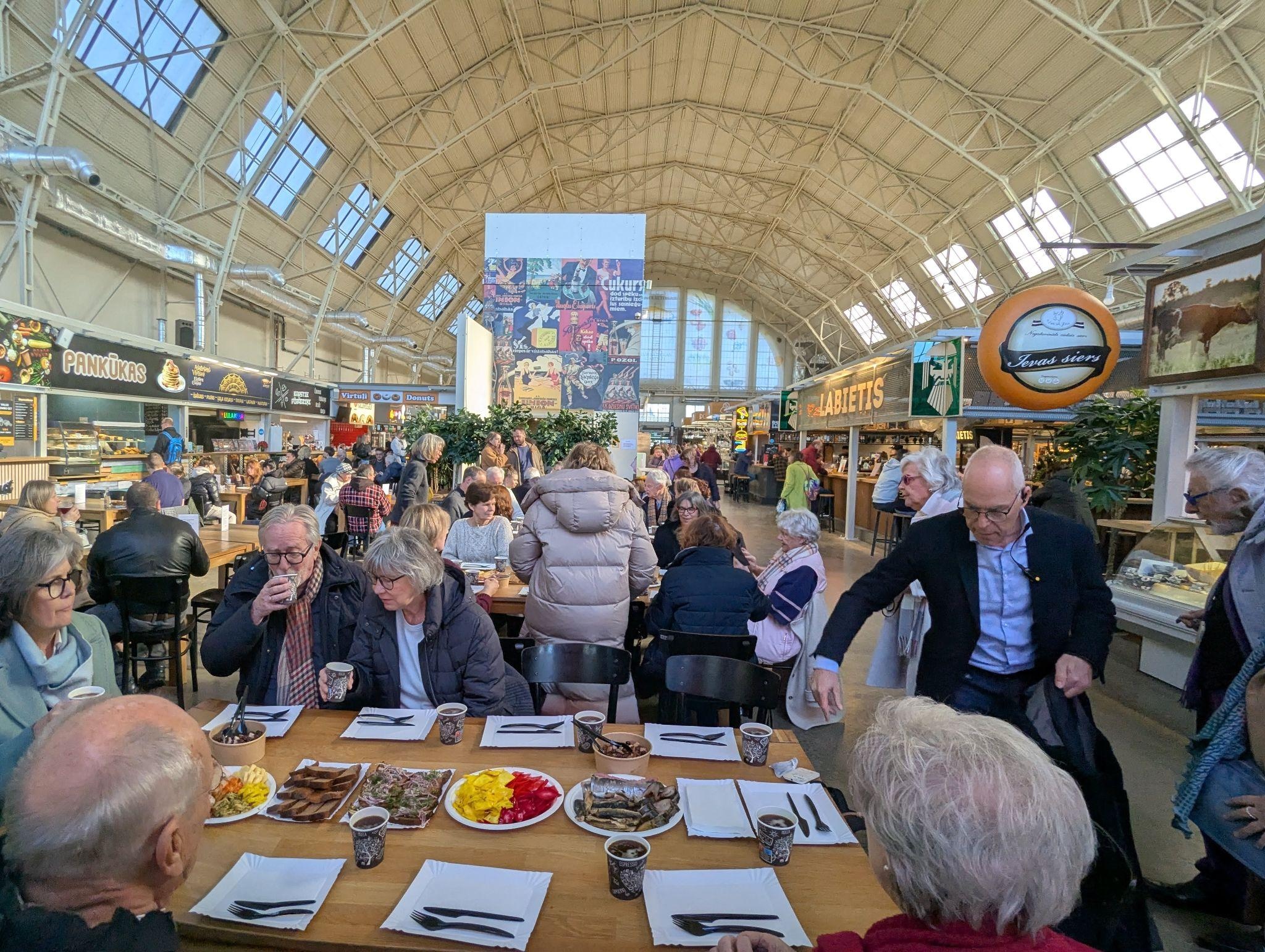 Ankunft in Riga. Hurra, alle Koffer sind da - und Hunger. Ja, die Markthallen rufen. Die freundliche Reiseleiterin unterhält uns plaudernd auf der Fahrt ins Hotel. Koffer deponieren und weiter geht’s im kühlen Sonnenschein zu den Markthallen gegenüber. Was man aus alten Zeppelin-Luftschiffhallen aus der Zeit vor 1914 nicht alles gestalten kann. Unter dem hohen Tonnendach stehen die lettischen Köstlichkeiten an langen Tischen bereit. Fisch in allen geräucherten oder eingelegten Variationen, Kohl in kräftigen Gelb- und Rottönen, leckeres fettes Schweinefleisch, Käse, dunkles Brot und Kwas, das niedrigprozentige Bier aus vergorenem Brot. Alles, was das Herz begehrt, köstlich. Ein kurzer Rundgang durch die mit einheimischen und internationalen Leckereien gefüllte Halle; eine von fünf, die nach dem 1. Weltkrieg den schönsten Markt Europas bildeten.