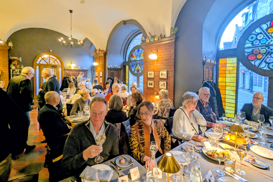 Kurze Auffrischungspause im Hotel und - wieder vorbei an einigen Highlights der Altstadt - ins Restaurant Rozengrals. Am Eingang sitzt eine finster blickende Gestalt in einem riesigen Gewand. Das sieht nach Räuberhöhle aus. Eva vertrauend, steigen wir vorsichtig die steile, schwer zu gehende Wendeltreppe hinab in die Höhle. Diese entpuppt sich als wunderschönes weitläufiges Kellergewölbe, stimmungsvoll düster durch Kerzen beleuchtet. Mittelalterlich gekleidete, freundliche Mädchen und Jungs empfangen und geleiten uns zu langen blanken Holztischen, die eingedeckt sind mit Salaten und Brot als Starter, gefolgt von einer Fleisch-Trilogie mit Gemüse und Nachtisch. Lecker? Erstmal mit der Taschenlampe nachschauen, was da serviert wird. Sieht vertrauenswürdig aus, also kann´s losgehen. So wurde mit Bier- und Weinbegleitung fleißig geschmaust und mit steigendem Geräuschpegel parliert, bis es Zeit fürs Bett wurde, in dem man vom schönen Tag träumend bald entschlummerte.