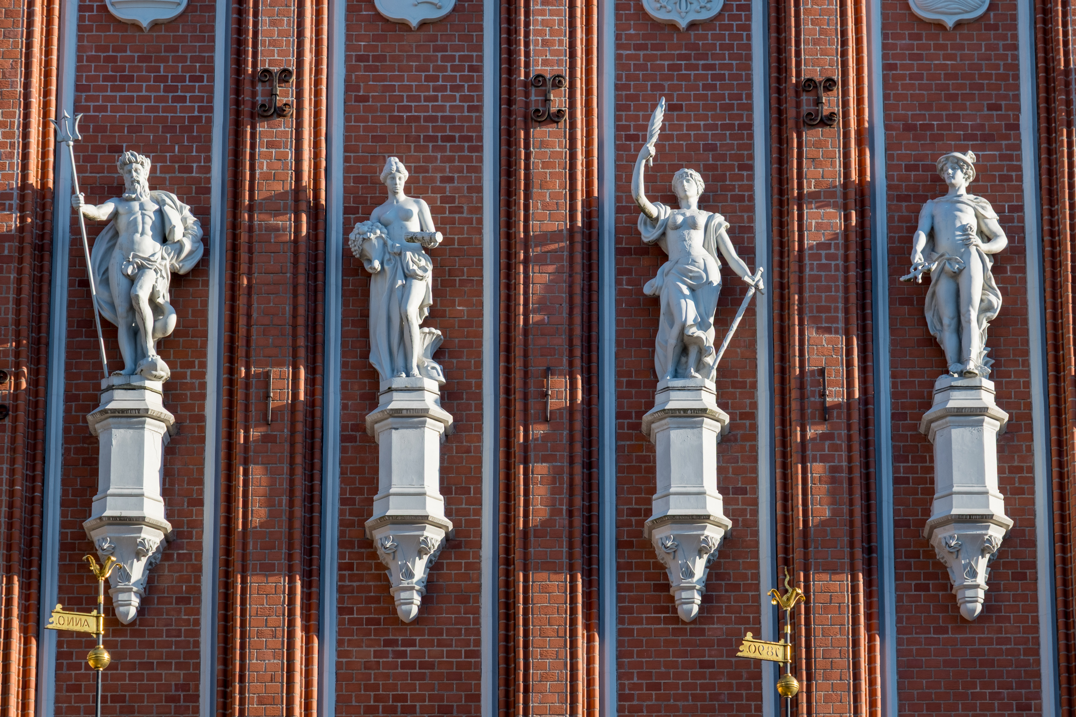 Der Reiseleiterin folgend, spazieren wir durch die schöne Altstadt. Jugendstil wechselt mit Mittelalter und Gründerzeit und säumt die verwinkelten unebenen Pflasterstraßen. Dom, der älteste Sakralbau des Baltikums, davor die Bremer Stadtmusikanten, Gildehaus- und Speicherhäuser. Die 3 Brüder; eng stehende Handwerkerhäuser aus der Zeit vom Mittelalter bis zum 17. Jahrhundert. Das Katzenhaus, mit dessen Bau ein reicher lettischer Kaufmann der Rigaer-Gilde seine Verachtung aussprach, die ihm die Aufnahme verwehrte. Er baute ein Haus gegenüber dem Gildehaus und positionierte Katzenfiguren auf dem Dach so, dass sie ihr Hinterteil mit erhobenem Schwanz gegen das Gildehaus recken. Ach ja, nicht zu vergessen die Schweizer Botschaft, von deren Eingangsfries ein Putenköpfchen stark an Frau Merkel erinnert. Beeindruckend sind die herausgeputzten Ensembles aus verschiedenen Epochen.