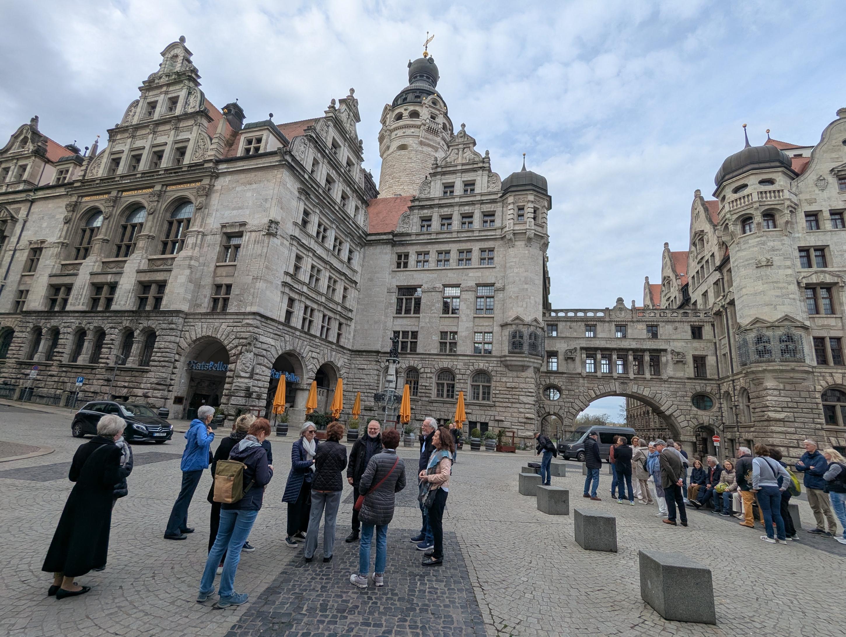 Gemischt trübsonnig und kühl kommt der Morgen daher. Wir schlendern durch die noch schlafende Innenstadt zum Neuen Rathaus, werden dort von einem Leipzigkenner empfangen und mit Anekdoten gewürzt in die Geheimnisse der Pleissenburg und der Geschichte des Neuen Rathauses eingeweiht. Ein trutziger, martialisch anmutender Bau riesigen Ausmaßes im Stil des Historismus. Und heute noch der größte Profanbau aus dieser Zeit weltweit.